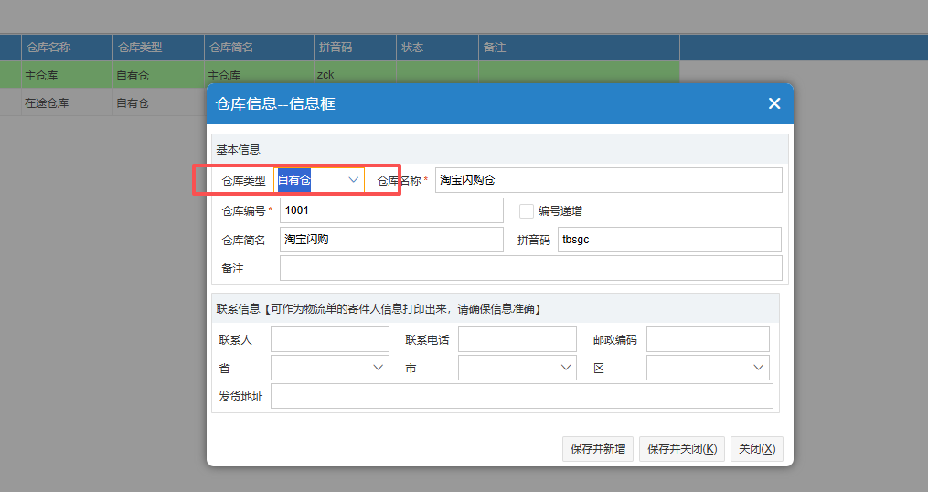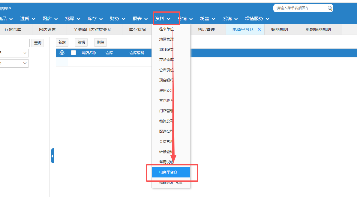 第三步:将平台仓与网店仓库对应,资料-电商平台仓,将线上仓库与系统内本地仓库进行对应,通过仓库编码的方式进行对应