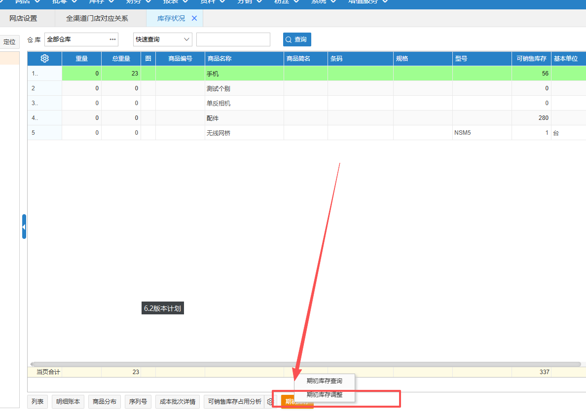 第四步:录入本地平台仓期初库存,库存——库存状况表——点击期初库存——期初库存调整,通过调整单来改变该仓库期初库存数量