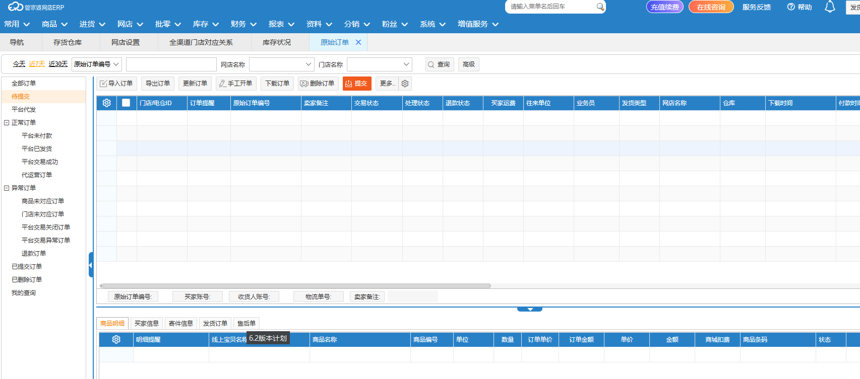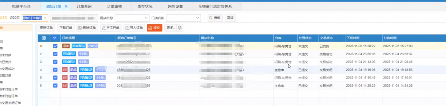 第一步:网店——网店原始订单——下载订单,等待平台发货后系统会自动发货记账