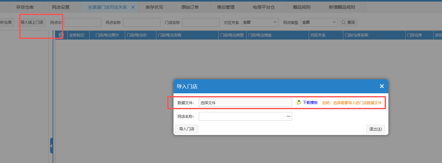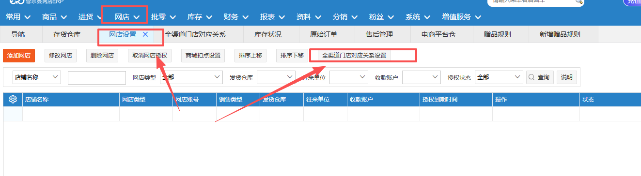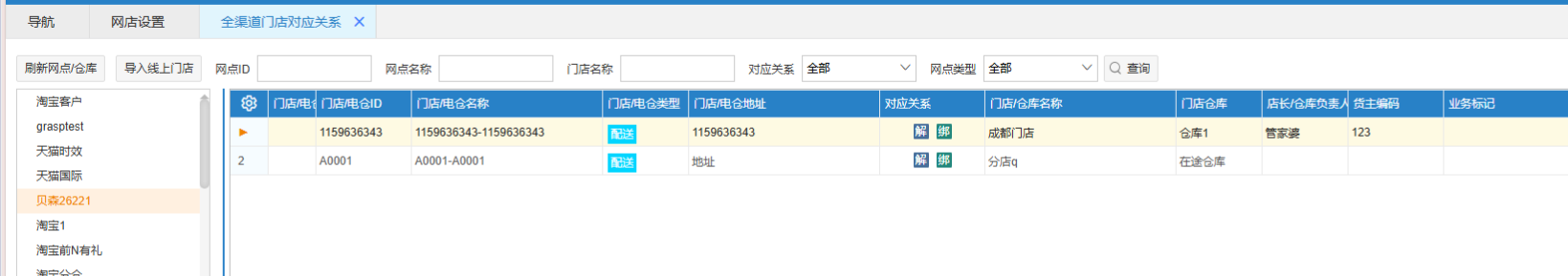 第三步:将平台仓与网店仓库对应,网店-网店设置-全渠道门店对应关系设置