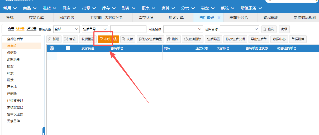 情况二:当订单发货后,买家申请退款且商家同意,系统自动标记为退款订单,在软件内自动生成退款退货类型的售后单,商家需要在网店—售后管理页面审核售后单,将系统内库存加回来