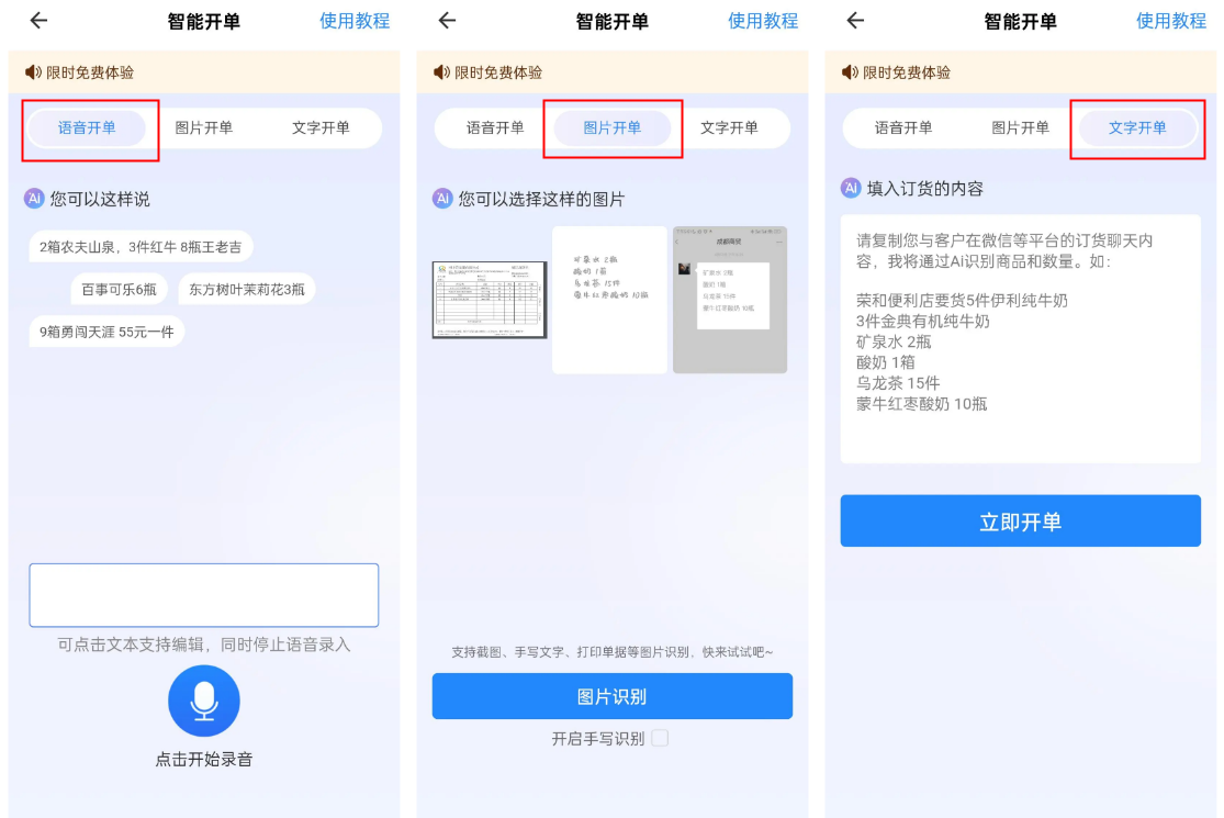 AI开单(智能开单) 一、适用场景在手机开单时,通过语音、图片、文字三种方式,实现快速开单,提升开单效率。二、操作说明1、支持单据类型采购订单、采购入库单,销售订单、销售出库单2、AI开单操作(1)点击“Ai开单”(2)根据当前需求,选择语音、图片、文字任意方式进行智能开单。