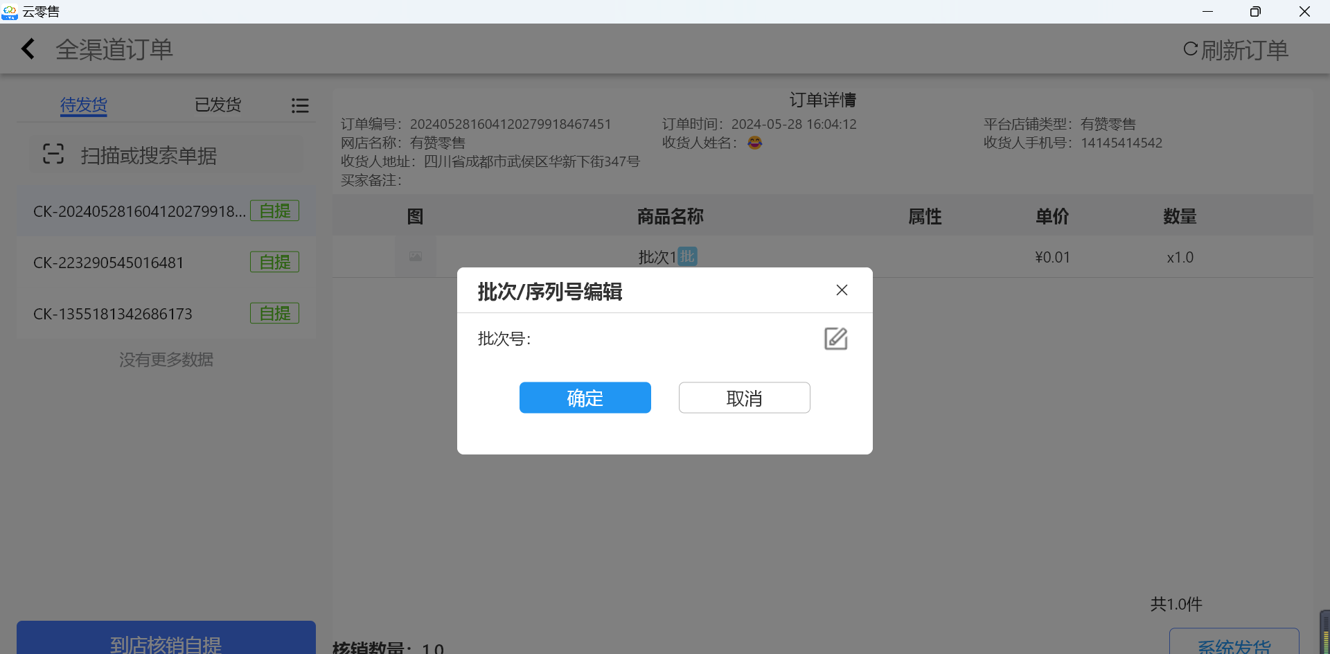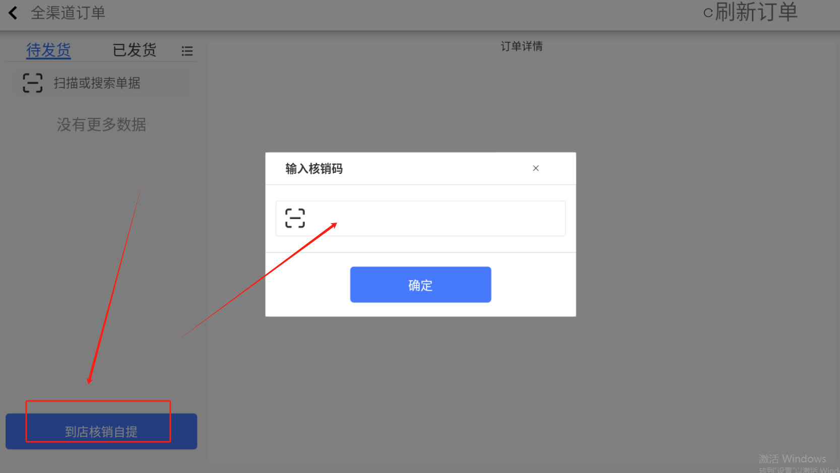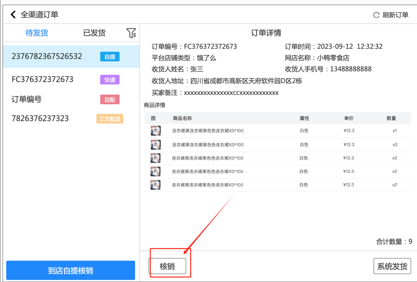 用于核销交货方式为“自提”类型的线上订单