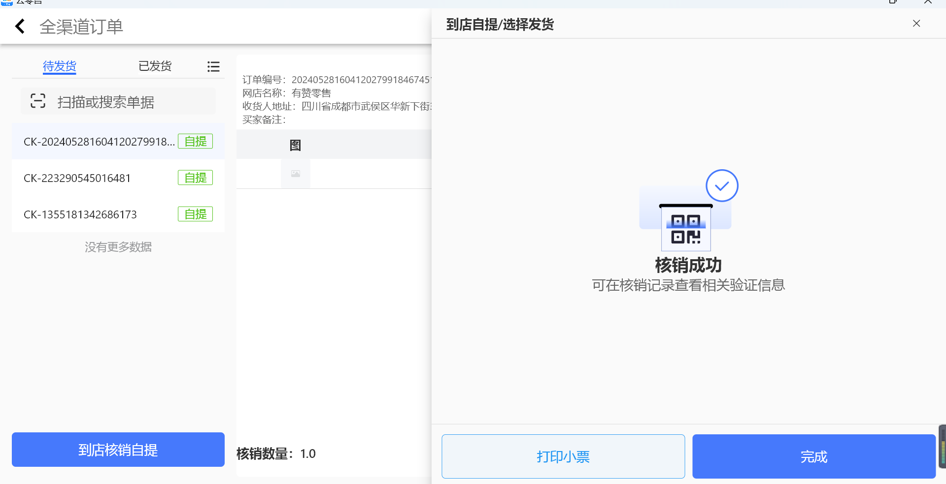 (2)如果需要打印单据,拿着单据去拣货,可在核销成功后,点击【打印小票】实现该操作。