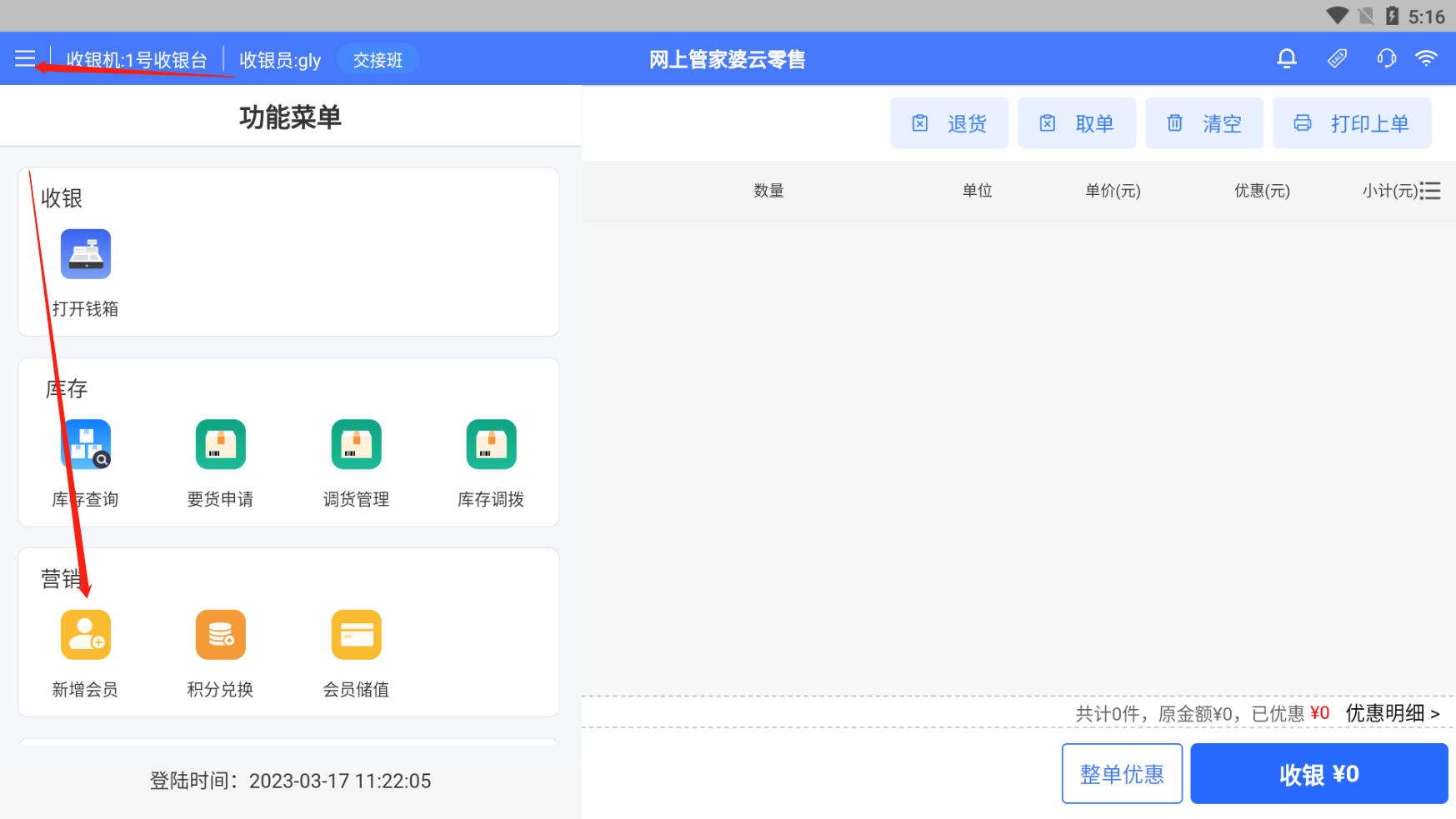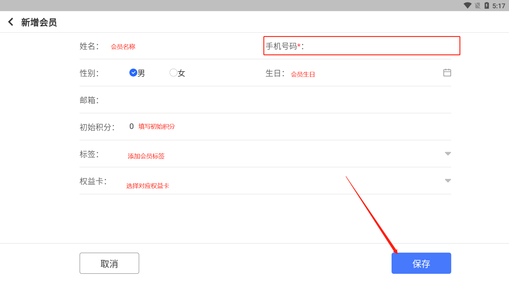 POS新增会员操作说明 功能描述:在POS端新增会员信息操作路径:左上角点击功能菜单,选择--新增会员选择新增会员,填写对应信息保存即可,除电话必填外,其余均为选填项新增会员后可以对会员进行 充值;积分兑换 ; 积分调整 ; 发放权益卡 ; 发放优惠卷 ;的操作