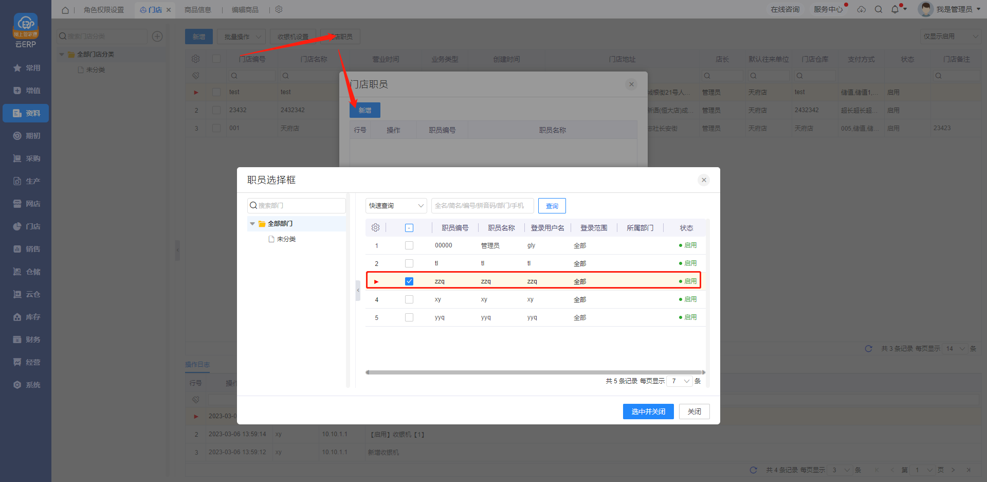 说明:用于登陆POS零售端的职员名称,在门店职员中新增,选择已有职员即可。