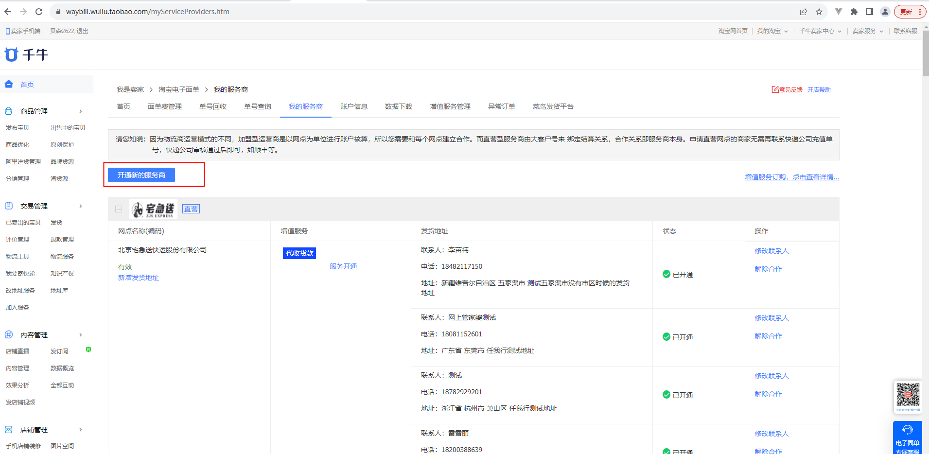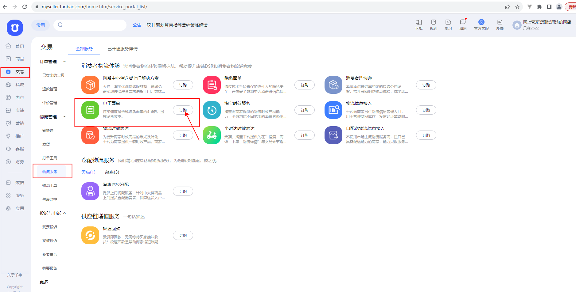 有店铺申请菜鸟电子面单 申请菜鸟电子面单服务之后,才能才ERP系统中获取物流单号进行打单。以下是菜鸟电子面单申请流程1.进入千牛卖家中心2.在物流服务中-全部服务-电子面单点击订阅跳转新地址电子面单服务商进行添加。维护网点信息完成新增和开通。维护网店信息完成后点击确认可以和网点联系,加快审批进度!