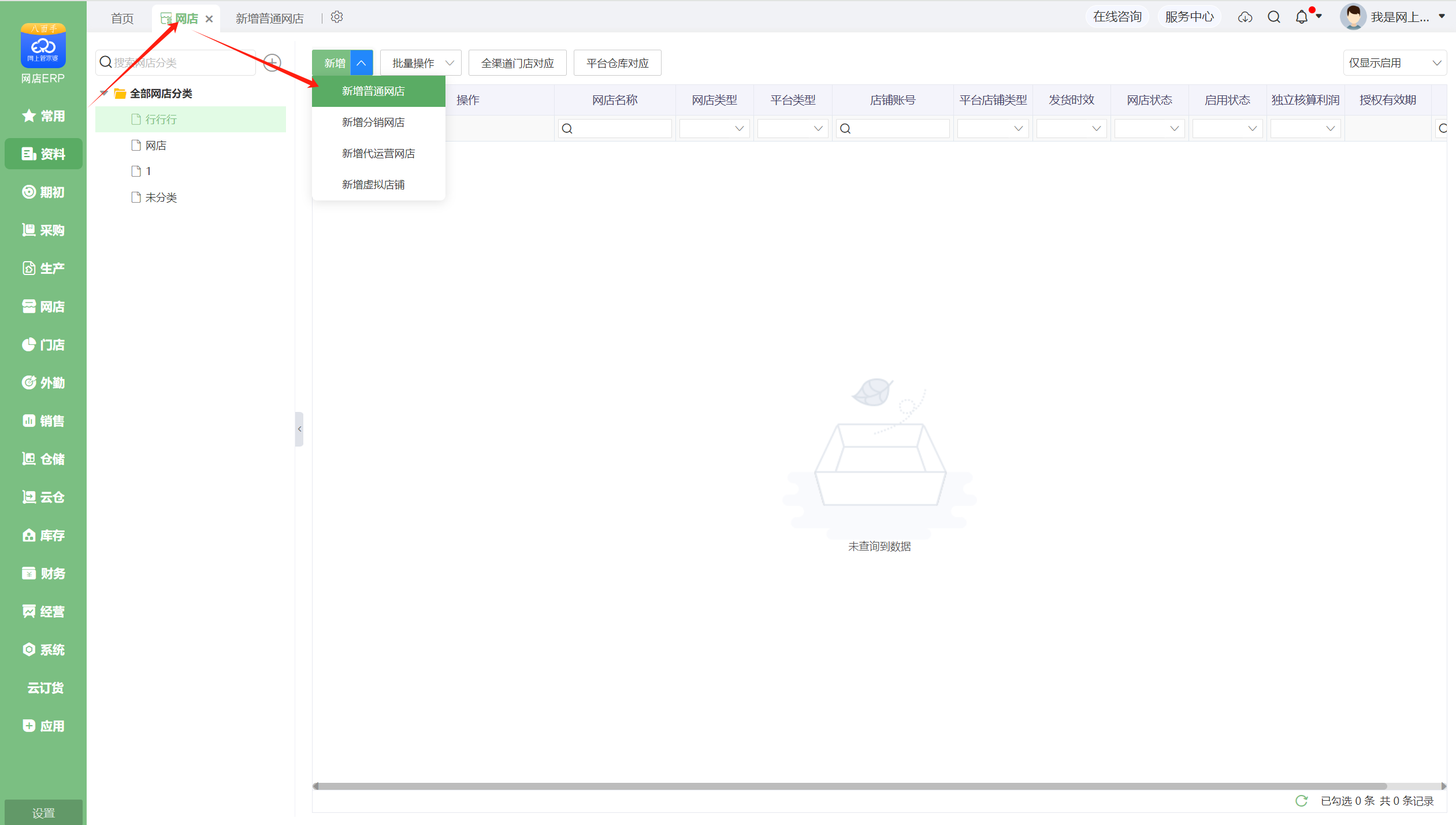 2、在【资料】--【网店】中选择新增网店