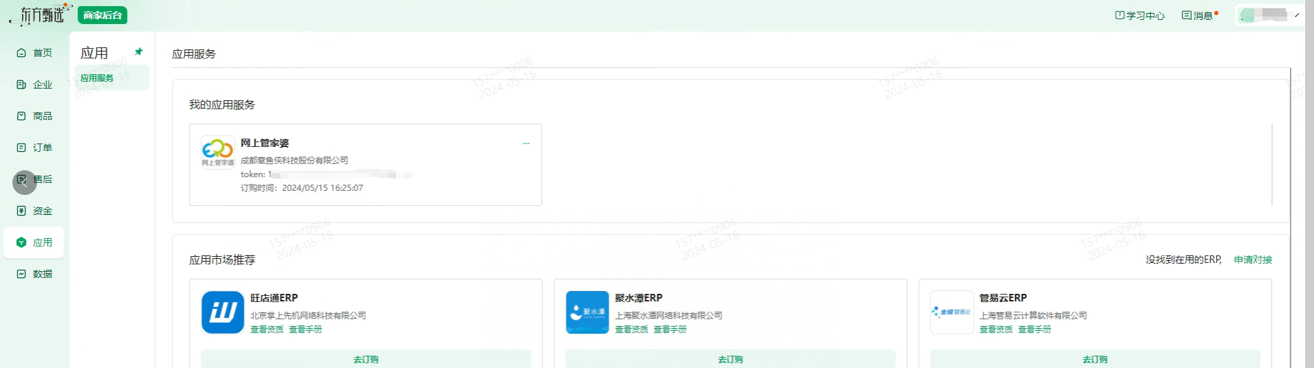 打开商家管理后台>应用,订购前需检查在商品请务必填写商品的商家编码,否则无法订购成功