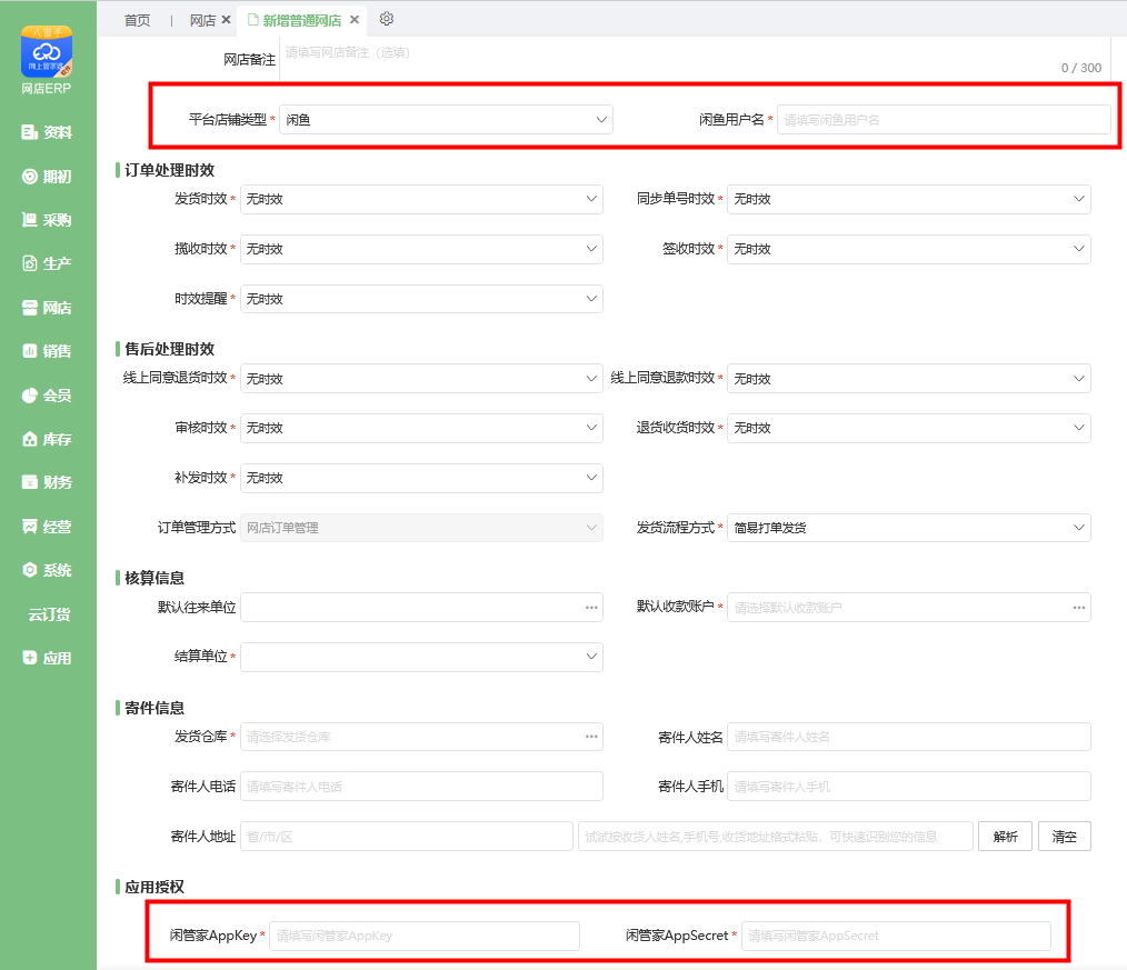 2、填写网店信息,闲鱼用户名,店铺名称,闲管家AppKey,闲管家AppSecret,以及其他基本信息