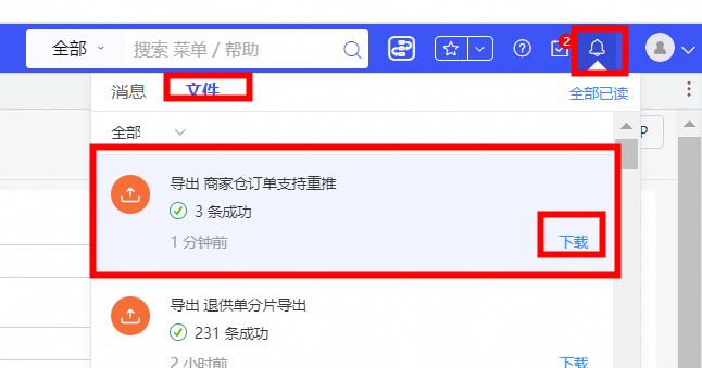 ② 在消息通知中,在对应的任务重,点击【下载】,就能查看/确认推送成功的订单