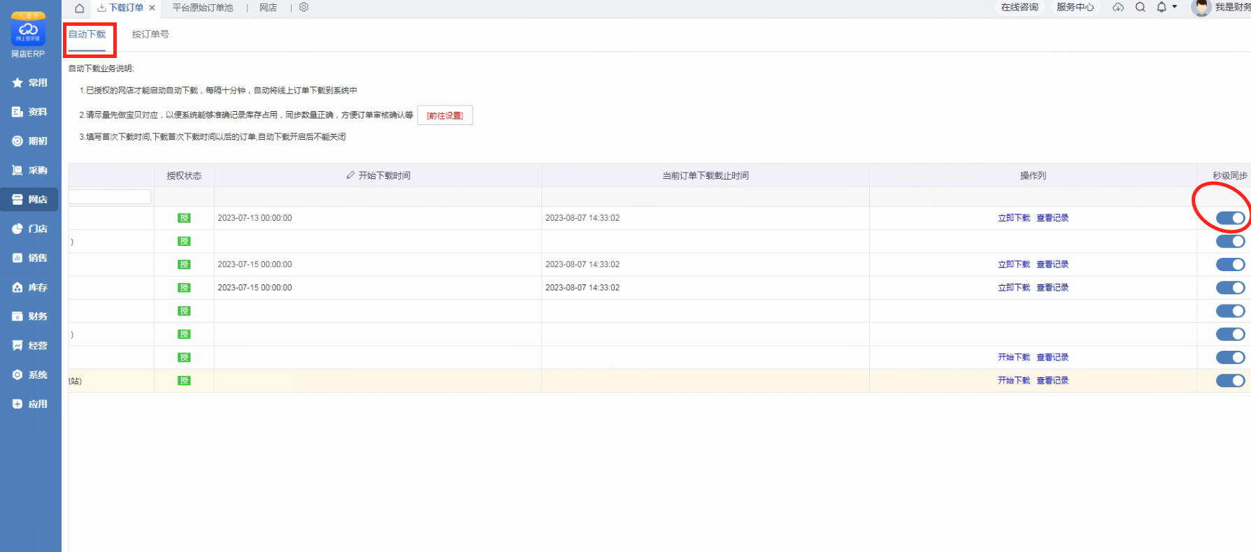 3、下载订单:订单由平台推送,开启“秒级同步”(也称“TMC”)可实现订单的自动下载